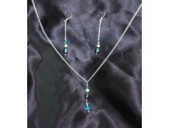 This necklace and earring set is made with swarovski crystals and freshwater pearls. Beautiful metallic, green, and blue beads.