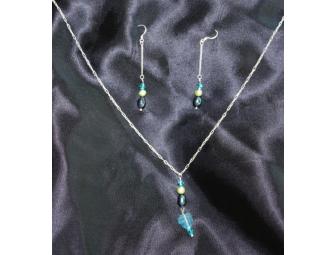 This set is made with freshwater pearls, glass beads, and Swarovski crystals. Blues and greens make this piece a must have.