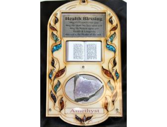 This plaque was hand-made in Israel. The carved wood has stone inlays and a beautiful piece of amethyst on it. The Health Blessing is written at the top and has a beaded hanger for easy placement in the home.