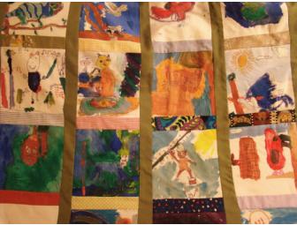 Using acrylic paint and fabice pens, Dimple and Stephanie’s 2nd and 3rd graders each created an 8” square to represent the animal that he/she is studying. The fabric was collected from parents and grandparents and one of the student’s grandmother’s came in and spoke with the class about the history and process of quilt-making. This finished quilt, measuring 56x46 inches, is an amazing collaborative work has been iron set and may be machine washed, making it a heirloom piece commemorating childhood at PS 3.