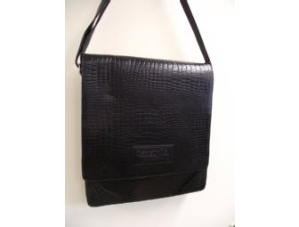 Texstyle/Jamie Stern black leather embossed messenger bag. Shoulder strap, interior pockets, 12.5"w x 14"h.