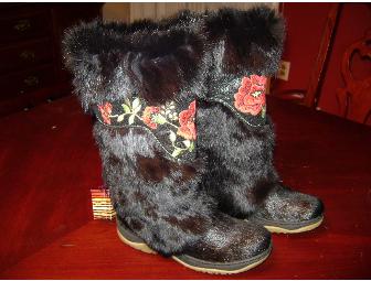 Bid on a heavenly pair of stylish Cochni black, furry boots from Karen Allen Fiber Arts. Boots are size 6 and not eligible for a refund/exchange.