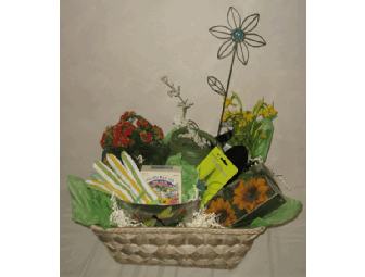 Beautiful Lined Basket with live Spring plants, Gardening Tools, Wildflower Seed Mix, Watering Can, Gardening Gloves, Decorated Planter, Floral Garden Ornament, Sunflower Floating Candles and a $20 gift certificate from Calareso's