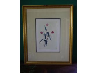 Elegantly framed botanical print, part of a pair with item 107. The finished size is 17.5" x 23.75".