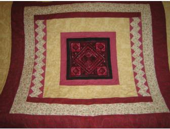A piece of traditional Arab embroidery is the centerpiece of this quilt. Created by Amy Kronish in cooperation with the Bedouin women of Laqiya, from their Center for Bedouin Embroidery. Quilt is 42" x 51" and it can also be used as a wall hanging.
