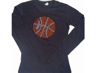 You love bling and sparkle no matter the occasion. Don't let a little sports hamper your style. Support your child and/or team with this beautiful Black long-sleeved T-shirt with a large orange and clear rhinestone basketball adorning the front. T-shirt is a size small.
