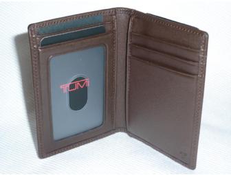 Men's TUMI leather multi-window card case in rich, chocolate brown. Dimensions: 3.1" X 4.25".