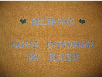 BICHONS - LOVE COVERED IN FLUFF. This 100% cotton 24" x 36" tan bathmat with blue cross stitch will be sure to bring a smile to your face everytime you use it.