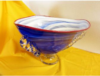 An elegant, free formed hand blown glass bowl with swirling inside colors (approximately 16" wide, 11" tall). The sweeping shape is enhanced by clear glass additions on three sides. From Rosetree Glass Studio (2008) crafted (and signed) by Mark Rosenbaum. Mr. Rosenbaum is an award-winning glass artist who lives in Algiers Point in the city of New Orleans, LA.
