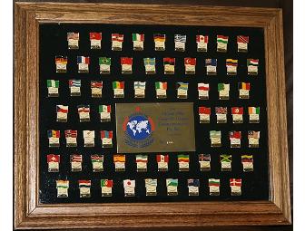 Additional Information: This unusual historic piece includes 62 limited-production enameled pins of the flags of most of the countries participating in the first Goodwill Games in Moscow, Russia a quarter-century ago. They include countries whose names and and/or boundaries have changed such as Burma (now Myanmar); Czechoslovakia (now the Czech Republic and Slovakia); FRG (the Federal Republic of Germany, informally known as West Germany); GDR (the German Democratic Republic, formerly called East Germany); PRK (the people’s Republic of Korea, now known as North Korea); and the USSR (the former Union of Soviet Socialist Republics). The Goodwill Games was an international sports competition created in reaction to political troubles surrounding the Olympic Games of the 1980s and was intended to be a way to ease tensions during the Cold War through friendly athletic competition between nations. The first summer Goodwill Games, held in Moscow in 1986, featured 182 events and attracted more than 3,000 athletes representing 79 countries. With the end of the Cold War, the Games’ focus shifted toward youth initiatives. The Goodwill Games have been discontinued, making this piece even more significant.