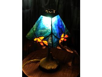 Additional Information: The unusual waterglass adds to the distinctiveness and sense of movement in this vibrant piece. Each of the shade’s four 7-3/4” x 7-/12” sides is accented with a lovely stained glass fish. The accent lamp’s base is metal with a hand-rubbed brass finish, and the light is controlled by a pull chain.