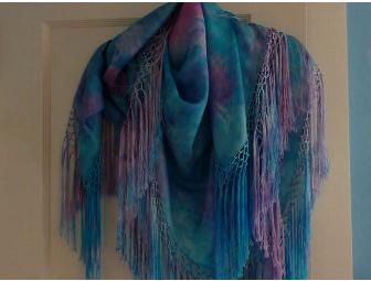 Additional Information: This one-of-a kind, hand-dyed silk scarf can be worn in numerous ways and will provide a gorgeous accent to outfits ranging from casual to formal. The rich blue, green, teal, and pink hues give this scarf individuality—and its wearer a distinctive panache. It livens up any outfit and makes a wonderful wrap to wear year-round in any climate. The lush, delicate fringe fully borders the scarf and adds to the beauty of the piece.