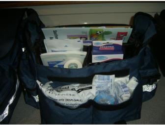 Navy Blue first Aid Bag 18x12x8 filled with bangages, tape, cold packs, gauze pads, bandaids, coloring books, information books and more.