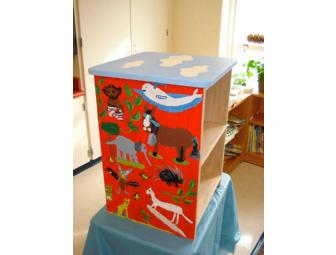 Beautifully crafted night-stand sized bookcase.  This book case was artfully decorated by the students in Mrs. Melville's First Grade Class.  The bookcase is painted in a "mammal" motif.  A stunning addition to any child's room or playroom....