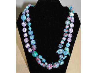 This is a handmade necklace. Made using clay and glass beads. Turquoise, blues, and purples make this piece really pop.