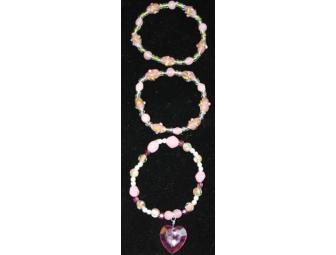 Pretty in pink kid bracelets. These are handmade with pink and white beads on elastic bands. Any little girl would love to have these bracelets to wear during dress-up or going shopping with mommy.