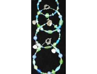 beautiful handmade beaded bracelet. Made with green and blue glass beads and accented with silver cat faces. T-clasp closer is a fish. A lovely set for any cat lover.