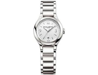 Stainless steel case and bracelet. Silver dial. Date displays at 6 o'clock position. Scratch resistant sapphire crystal. Hidden deployment clasp. Crown set with 1 diamond. Case diameter 30mm. Case thickness 8.5mm. Quartz movement. Water resistant at 30 meters (100 feet).