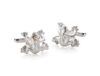 Set of playful hand-made sterling silver cuff links. Each cufflink is a frog, but one cuff link is also a prince with 18k yellow gold crown set with a .04 carat diamond. These are from Jerry Szor Contemporary Jewelry, 6131 Luther Lane, Suite 210, Preston Center, Dallas.