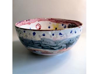 Beautiful 12" diameter ceramic salad bowl decorated by the third grade class, encouraged by local ceramist Michael Wainwright. Food-safe, dishwasher safe.