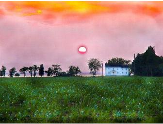 Additional Information: Shot on historic Tilghman Island in the Chesapeake Bay, this peaceful yet powerful photograph captures the vivid contrast between the pristine purity of the white frame house set in a field of lush green grass and the vibrant, almost tropical, colors of the sun setting over the waters of the bay.