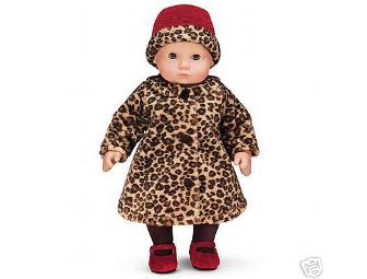 This Bitty Baby Chocolate Cherry Coat and Hat was made by the American Girl Company for the 15" Bitty Baby doll. Add to Bitty Baby's sweet-as-sugar holiday look with a spotted faux-fur swing coat and a cherry-red chenille hat with furry trim. This is a coat and hat, that is now retired.