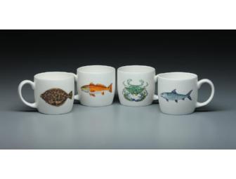 These handsome coffee mugs by Red Cabin Pottery are not clunky and heavy because they are made with Bone China (on the island of Jersey, U.K.) for "drinkability." They are dishwasher-, microwave-, and freezer-safe and measure 3" tall by 3" wide. The Saltwater Mug complete set consists of the Blue Crab, Bonefish, Flounder, and Redfish.