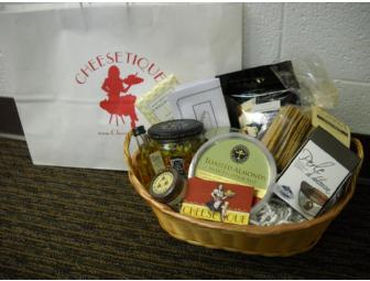 Yummy basket filled with treats from Del Ray's renowned Cheesetique includes varied and delicious condiments, crackers, wines and cheeses. Also, includes gift certificate to Cheesetique.