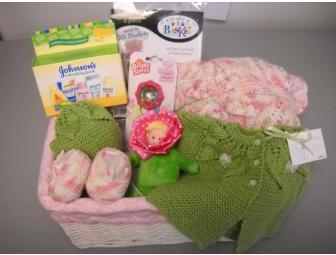Spoil the baby girl in your life with precious handmade knits for baby girls aged 3-6 months. Basket includes : sweater, hat booties, blanket, rattle & shake barbell, Little Sprout Baby Rattle, and Johnson's Take Along Pack.