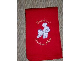 A mini waffle weave kitchen towel in a pretty red and embroidered with our unique design: Cookin' Bichon Mom.