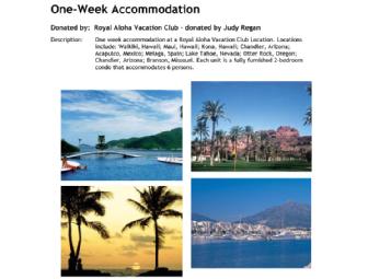 One week accommodation at a Royal Aloha Vacation Club Location. Locations include: Waikiki, Hawaii; Maui, Hawaii; Kona, Hawaii; Chandler, Arizona; Acapulco, Mexico; Melaga, Spain; Lake Tahoe, Nevada; Otter Rock, Oregon; Chandler, Arizona; Branson, Missouri. Each unit is a fully furnished 2-bedroom condo that accommodates 6 persons.