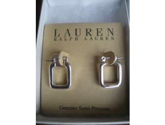 Two sets of stylish pierced earrings from Lauren by Ralph Lauren. The first are chic cut-out square silver-plated drops. The second are delicate faux pearl teardrops.