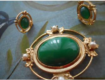 Vintage large gold tone oval pin with dark green oval glass center stone. Leaf clusters and simulated pearls frame the green glass on four sides. Matching pierced stud earrings. Comes in grey velvet box.