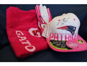 Tom Brady autographed this hat from the 2010 Breast Cancer Awareness Game. It also includes a towel and receiver's gloves.
