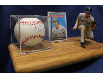 This collectible ball and figure are mounted on a wooden base with a Pedroia baseball card. The ball is signed by Pedroia.