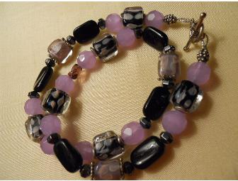 Hand blown glass of pale violet tones contrast with deep black glass beads to highlight the lovely grayish lavender color. Measures 17 inches long. Closure is silver toggle clasp. Beads include Czech glass, hematite and Indian glass and sterling silver beads.