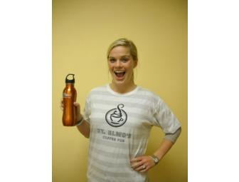 Show your enthusiasm for local St. Elmo's Coffehouse while looking fashionable at the same time. Includes orange stainless steel water bottle and size large t-shirt in a comfy cotton blend.