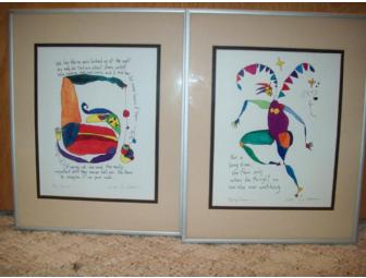 Two radiantly colorful Storypeople prints, 14 1/4" by 11 1/2" framed, depict scenes from the vivid tales created by the folks at Storypeople.com