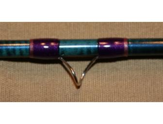 The Struble Burl Madrone reel seat and nickel silver winding check match nicely with the hard chrome guides, two stripping guides, and oversized tip-top. This is simply a beautiful rod! The portion just above the grip has not been expoxied yet so that the winner can have the rod personalized. I will then apply the second coat of epoxy to the rod guides also.