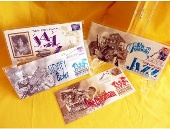 - FOUR (4) Limited Edition Jazz Fest cachets! ONE Irma Thomas cachet from 1992 featuring textured rich purple foil and luminescence silver foil for the Jazz Fest logo. The postal collection features two 45 records and quarter notes. ONE Pete Fountain cachet from 1993 featuring teal foil print with geometric luminance and a wonderful pin and ink collage of Fountain by Dick Bobnick and a Cole Porter stamp. The postmark features hands on a clarinet. ONE Doc Cheatham cachet from 1996 featuring hot pink foil printing, a trumpet cancellation, and a Louis Armstrong stamp along with a detailed pen and ink collage. Numbered 2372 of 2500. ONE Sidney Bechet cachet from 1997 featuring blue foil print, a clarinet cancellation and a pen and ink collage of Sidney Bechet. Number 2281 of 2500.