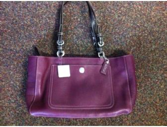 This authentic Coach handbag is the perfect addition to any fine collection. Genuine plum leather with brown straps and fabric lining. It has one pocket on the outside and three on the inside. Measures approximately 8"H X 14"W. Don't let this one get away!