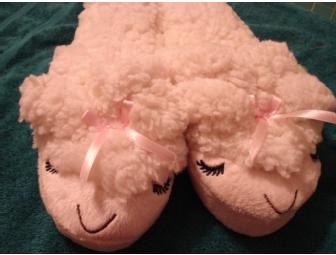 These are brand new slippers from Avon. They are supposed to be lambs but I thought they looked like sleepy girl Bichons! They are white and fluffy and have the cutest pink bow on their head. Size is Small. Fits ladies 5 - 7.