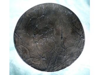 Dark gray enamel over cast aluminum platter from the EARTH: Forest Leaf Collection of Michael Aram. Approximate diameter is 9 3/4 inches.