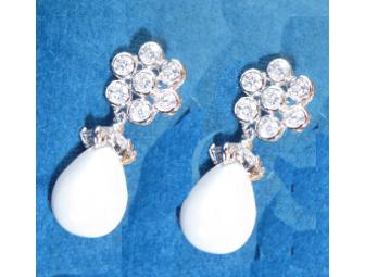 White pearl briolette drop earrings topped with tiny marquise cut CZ petals and dropped from 7 round cut CZs by Kenneth Jay Lane.