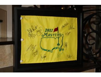 Rare framed 2011 Official Masters Tournament flag autographed by 10 Masters golfers including 2011 Masters Champion Charl Schwartzel.