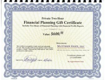 Let the professionals at Matthew Goff, LLC help you with your financial planning. This gift certificate entitles the winning bidder to two hours of financial planning and financial profile reports to help you achieve your goals. A variety of investment topics that are important to you may be reviewed including: 1) creating a realistic, long-term financial plan; 2) key issues to consider for your financial plan; 3) setting specific financial goals that are both realistic and timely; 4) your financial risk tolerance; and 5) developing a budget that works for your lifestyle.