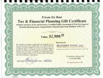 Let the professionals at Matthew Goff, LLC help you with your tax and financial planning. This gift certificate entitles the winning bidder to one hour of tax advice provided by a CPA, five hours of financial planning and a comprehensive financial plan. A variety of investment topics that are important to you may be reviewed including: 1) building a long-term investment strategy to meet your financial goals; 2) creating a realistic, long-term financial plan; 3) key issues to consider for your financial plan; 4) setting specific financial goals that are both realistic and timely; and 5) developing a budget that works for you.