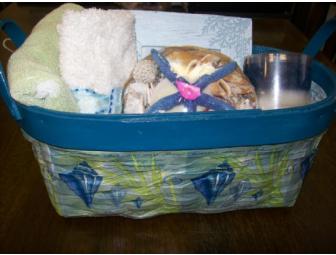 Decoupage Seashell Gift Basket by Jeanne Bennett includes a picture frame, candle, decorative shells hand towel and cloth.