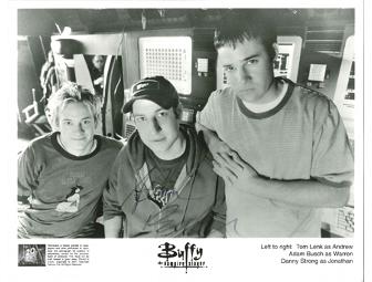 American actor who played the recurring character Warren Mears on the television series "Buffy the Vampire Slayer," Adam Busch autographed a pair of white Generic Surplus in size 10 1/2. He circled around fake blood that was used in one scene. Autographed head shot included.