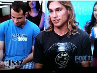 On-air cast of TMZ, an American syndicated entertainment and gossip news television show that premiered on September 10, 2007, Max Hodges is also clip clearance producer for the show. He autographed size 9 1/2 used grey slip ons designed by Vans Off the Wall. He added handwritten sayings, "Ban Shoes" and "Max Hodges was here."